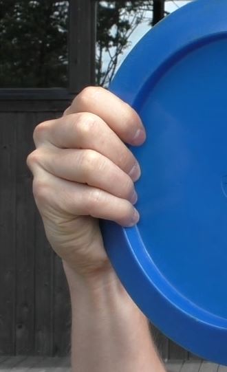 Ota kiekko käteesi siten että kiekon reuna kulkee etusormen juuresta vinottain kämmenen yli alla olevan kuvan mukaisesti.